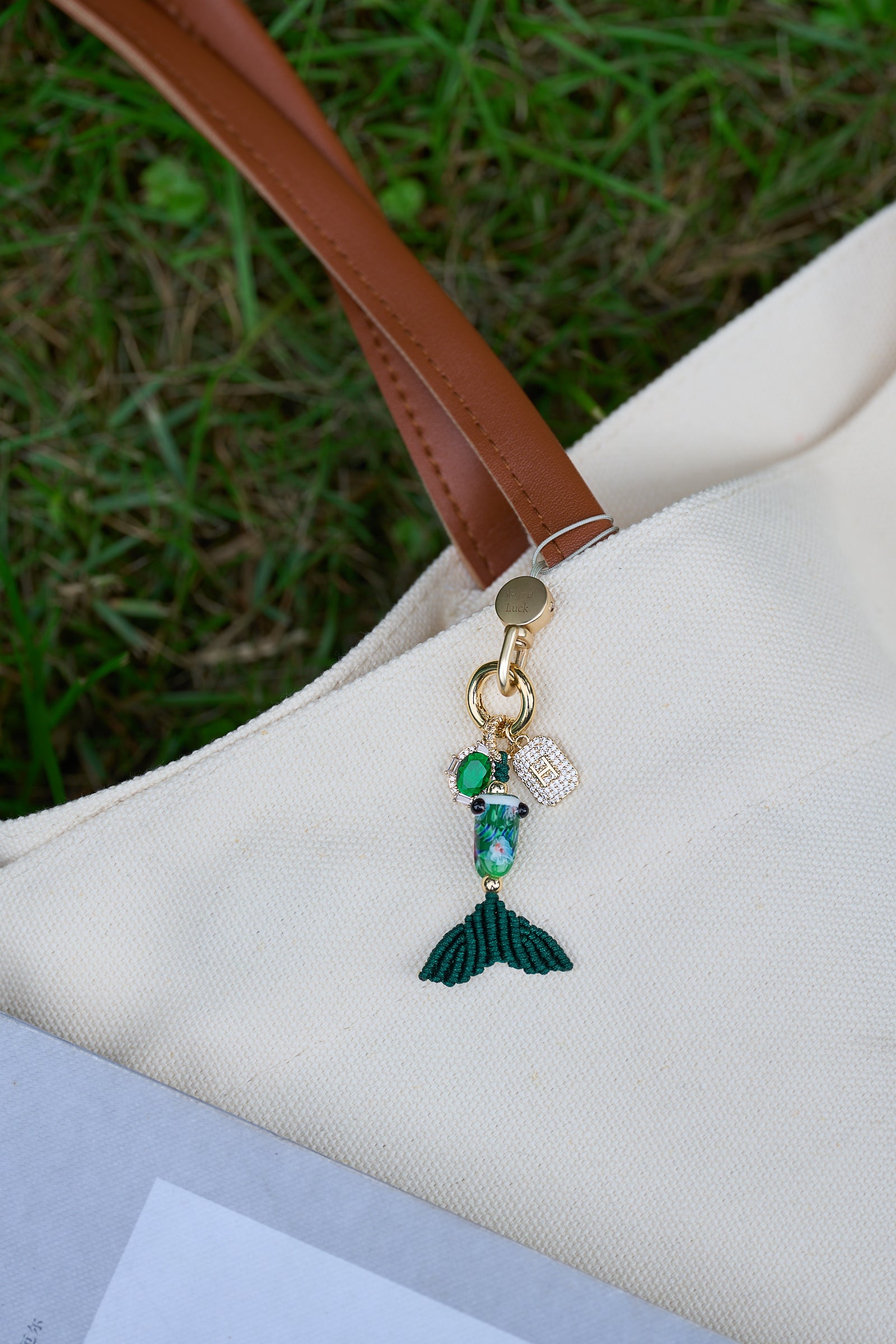 Crafted with a dark green fish bead and delicate fish tail detail, it's the perfect companion for your phone or bag.